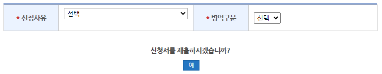 신청사유와 병역구분을 선택하시고 신청서 제출에 '예' 를 눌러 제출하시면 됩니다.