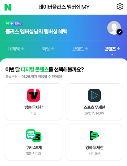 ① 네이버플러스 멤버십 MY > 디지털 콘텐츠+에서 기본 디지털 콘텐츠 혜택받기를 선택합니다.
