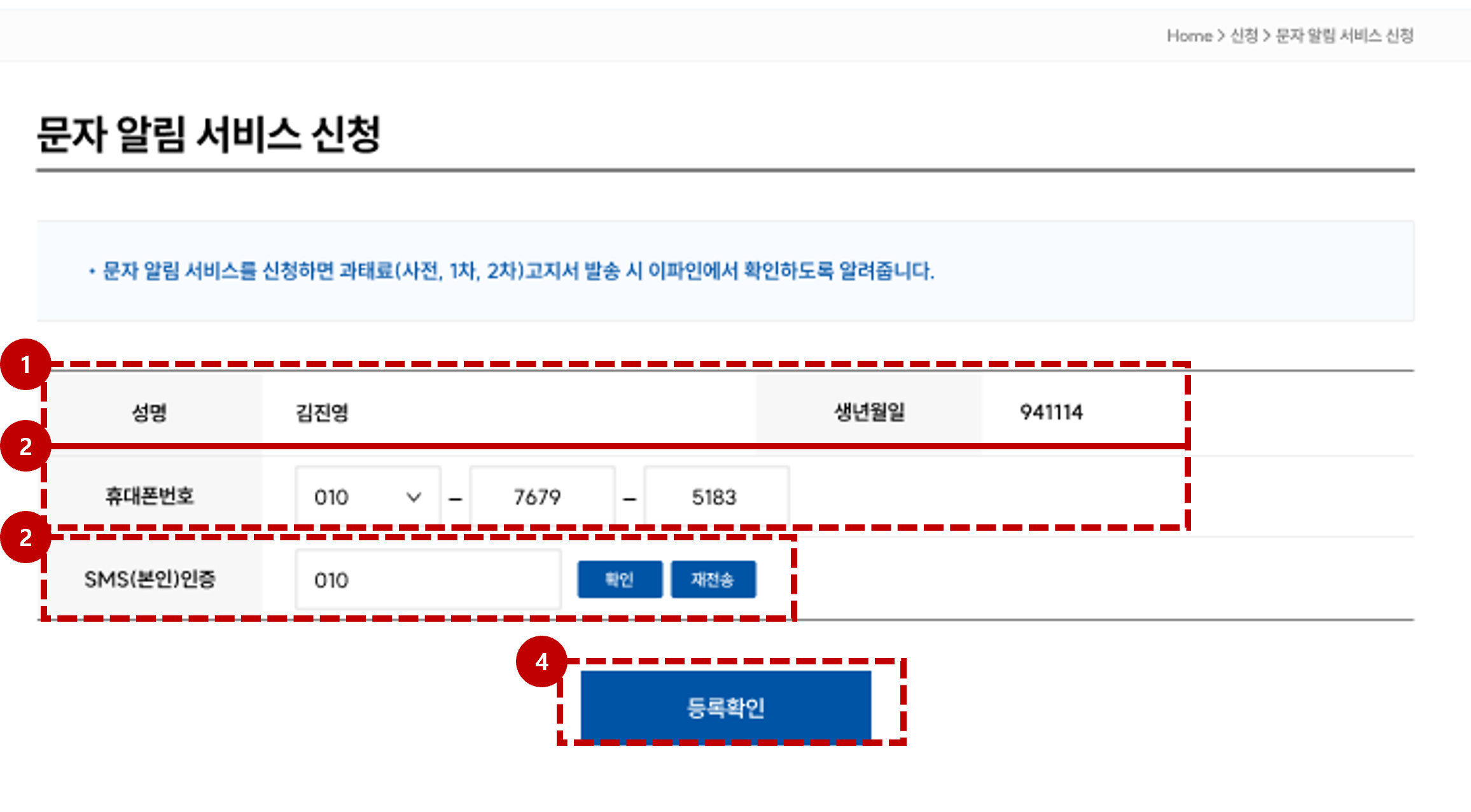 4.확인 버튼 : 입력한 내용으로 문자알림 서비스를 신청합니다.
