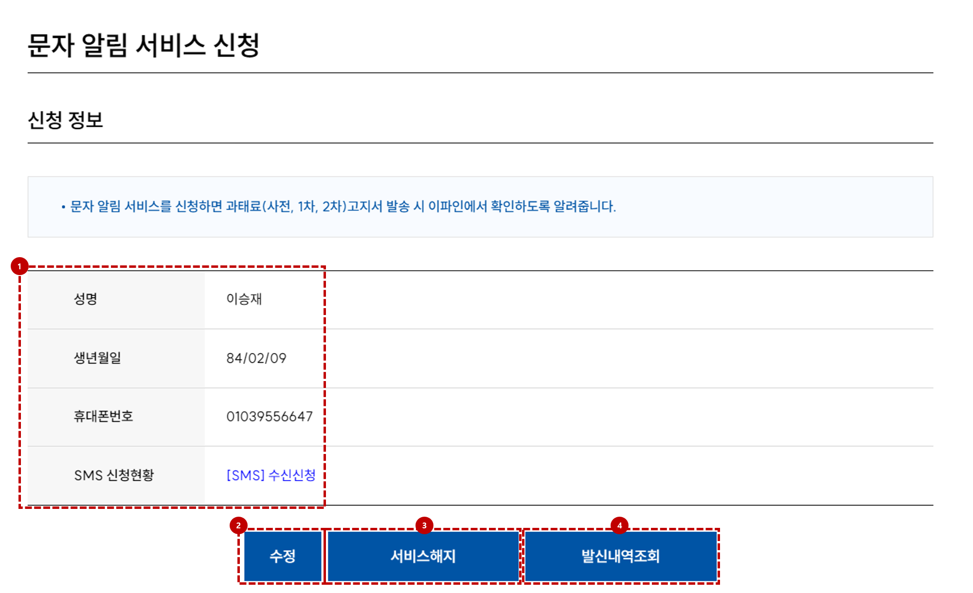 3.서비스해지 버튼 : 문자 알림 서비스를 해지합니다.