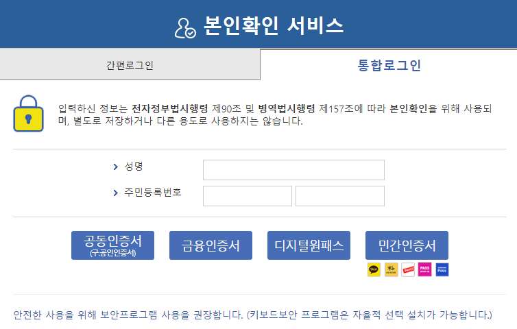 본인확인 서비스에서 로그인 방법을 선택합니다.