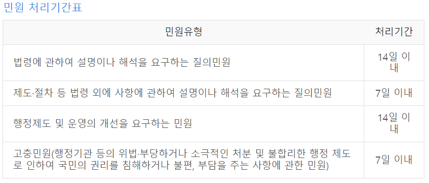 일반적으로 접수일로부터 7일에서 14일 이내에 처리되나 토요일·공휴일은 제외되며, 민원의 성격이나 해당 민원을 처리하는 기관의 규정에 따라 일부 달라질 수 있습니다. 아울러 부득이한 사유로 처리기간 내에 민원을 처리하기 곤란하다고 인정되는 경우에는 해당 처리기간의 범위에서 처리기간을 연장할 수 있습니다.