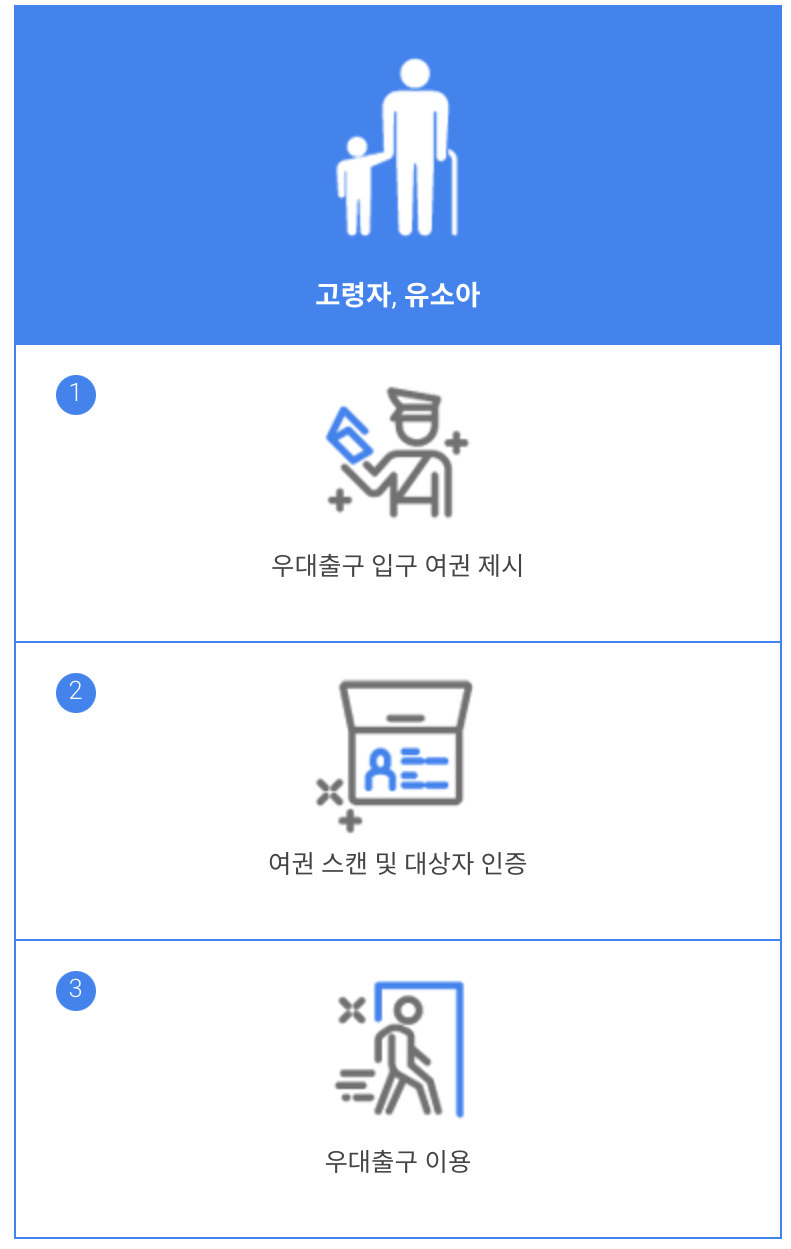 인천국제공항은 교통약자와 사회적 기여자의 출국 편의를 위하여 출국 우대출구를 운영하고 있습니다.